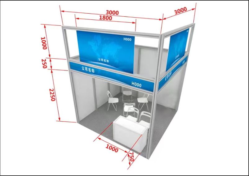 围板、地毯、一桌二椅、二只射灯、中英文楣板、5A/220v电源插座一个